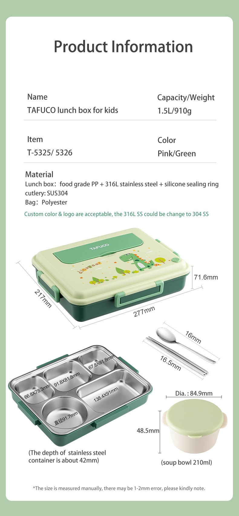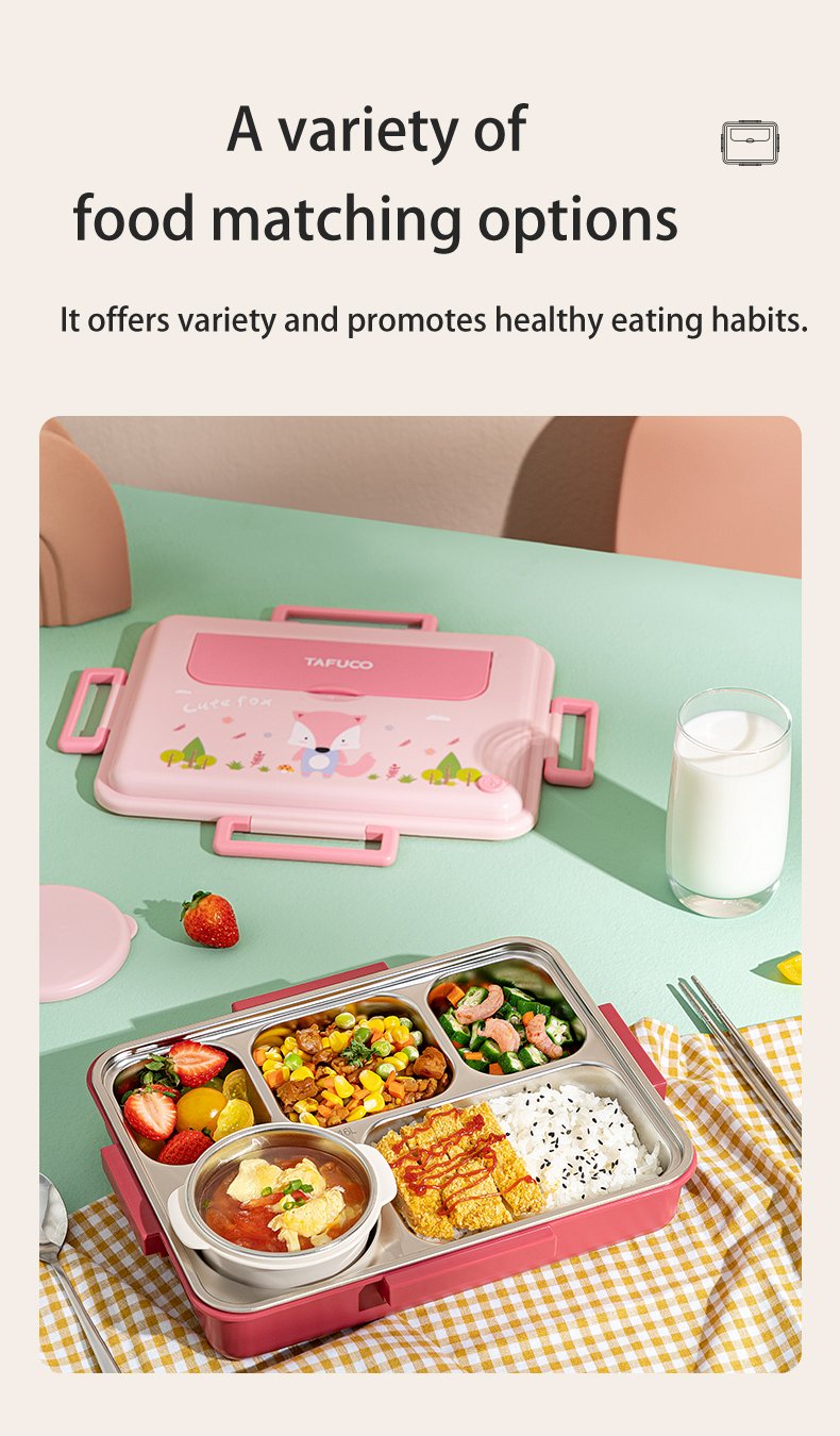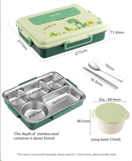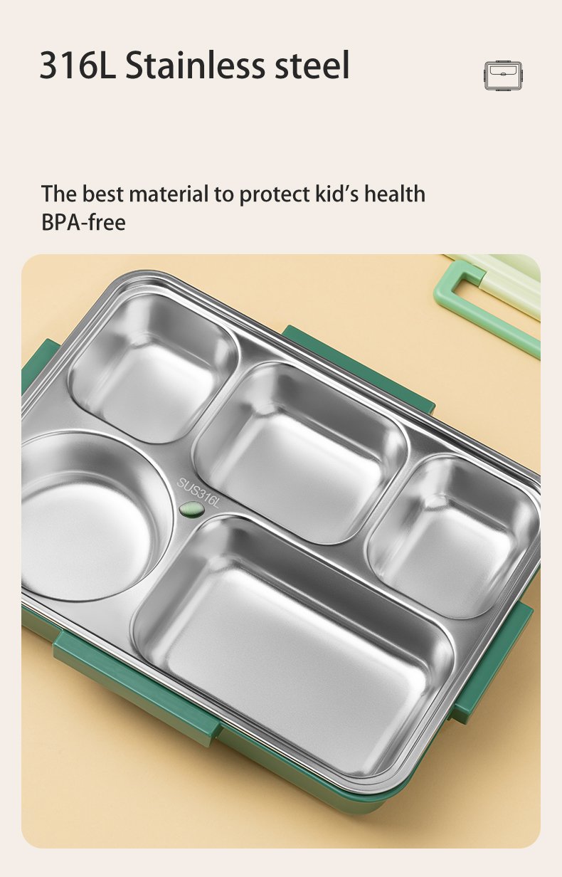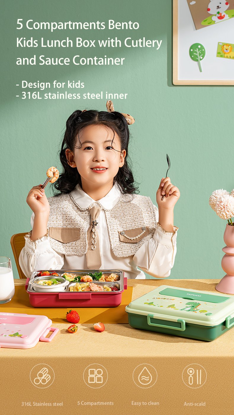 Looking for the best way to give your little ones a healthy, convenient, and enjoyable lunchtime experience? Our 5 Compartments Bento Kids Lunch Box with cutlery and sauce container is the perfect choice! Crafted with a durable and sleek stainless steel SUS316 inner, this lunchbox is not only resistant to stains and odors but also easy to clean. Its anti-scald properties and double-layered design ensure safe handling and maintain food freshness throughout the day.